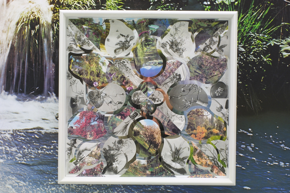 This series used the elaborate traditional patterns of Chinese garden tracery windows as a template for collages made of cut photographs on mirror. The subject matter of the collages was influenced by the fundamental Chinese principles of yin and yang in which opposites are brought into harmonious inter-relationship. These collages were hung on a composite of scenic wallpaper that wrapped the gallery walls and depicted a series of waterfalls, streams and ponds from a variety of locations and perspectives.